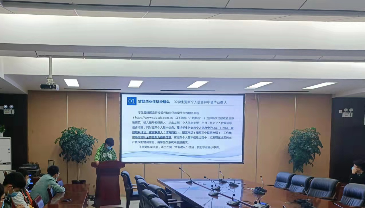 会议伊始,李保云指出助学贷款的政策就是为了不让一个学生因家庭经济困难而失学,她强调在享受国家政策的同时也应承担相应的义务——按时还贷,不恶意拖欠贷款。同时提醒学生注意防范诈骗,避免钱财损失。随后,资助助理李小鹏、王照智在两个会场分别讲解生源地贷款的几种具体还款方式、还款日期、注意事项及毕业确认的具体操作流程。会后,资助助理针对同学们的问题进行了详细的解答。为确保每一位高校贷款毕业生都能了解到此次会议的内容及以后的工作安排,对因特殊原因未能参加此次会议的同学采取了线上联系的方式进行了内容的传达。