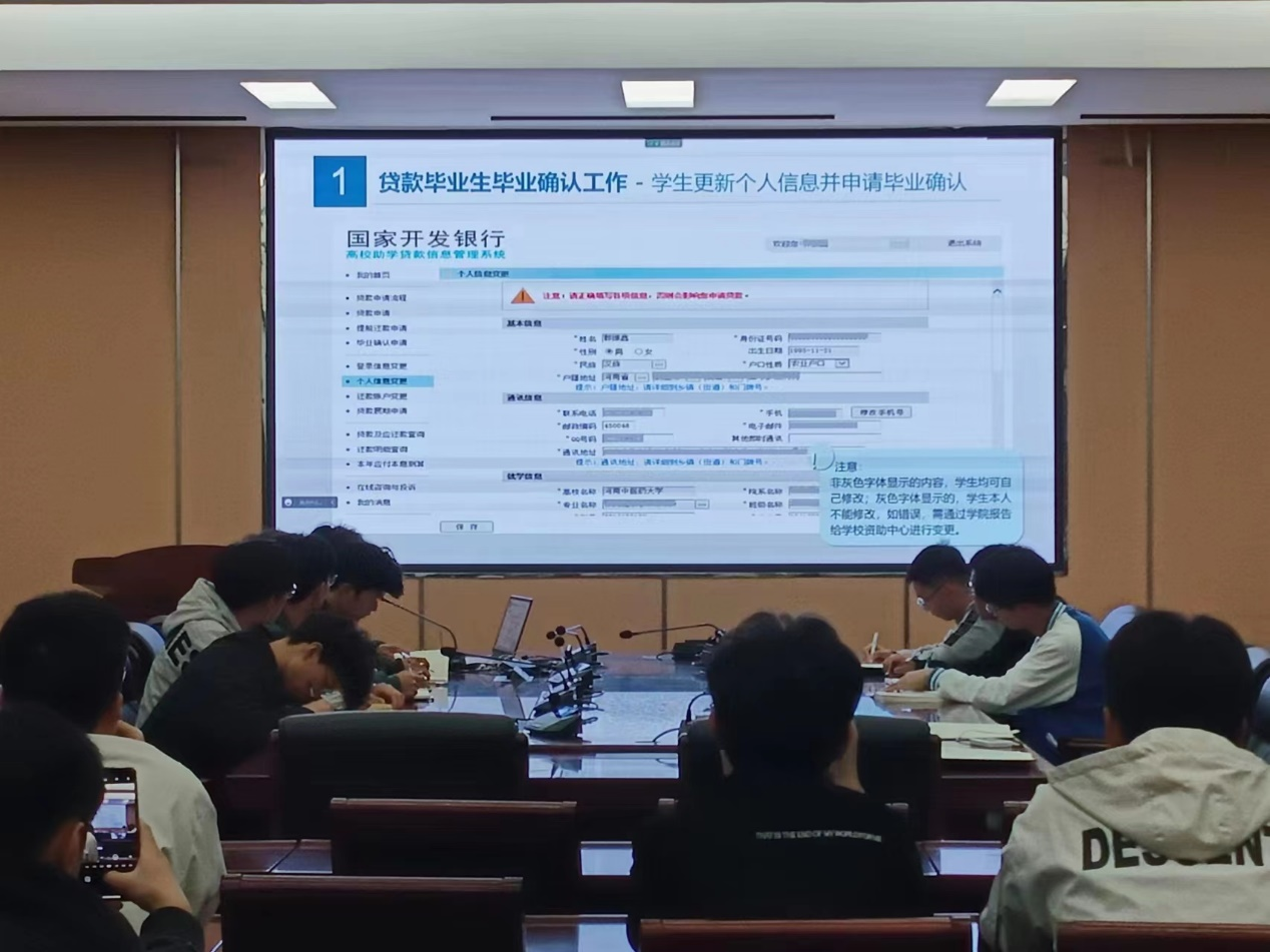 会上,郭珊珊向全体生源地贷款毕业生传达了学校关于2023届贷款毕业生贷后管理工作的相关文件精神,强调毕业确认工作的重要性。随后,郭珊珊介绍了生源地贷款毕业生毕业确认工作中的关键信息变更、毕业确认申请、还款计划变更等有关事项,并结合往年毕业生违约还贷案例,嘱咐同学们要树立牢固的诚信意识,提高自身防诈骗意识,认真履行贷款合约,及时还贷。最后,资助助理王俊超详细讲解了生源地贷款的各种具体还款方式、还款日期和毕业确认的具体操作流程及注意事项。