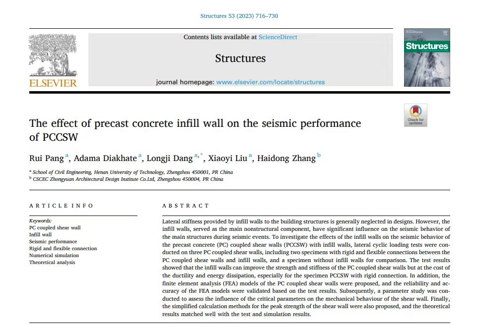 2019级海外留学硕士研究生AdamaDiakhat在国际高水平学术期刊Structures(JCR Q2,IF=4.010)上发表了题为“The effect of precast concrete infill wall on the seismic performance of PCCSW”(DOI:10.1016/j.istruc.2023.04. 076)的研究论文,该项成果为学院装配式建筑与智能建造科研团队围绕考虑预制混凝土(PC)填充墙的装配式联肢剪力墙结构开展一系列抗震性能研究的阶段成果,河南工业大学为论文第一署名单位和通讯作者单位,我校留学生为第二作者(团队负责人/留学生导师庞瑞教授为第一作者)。