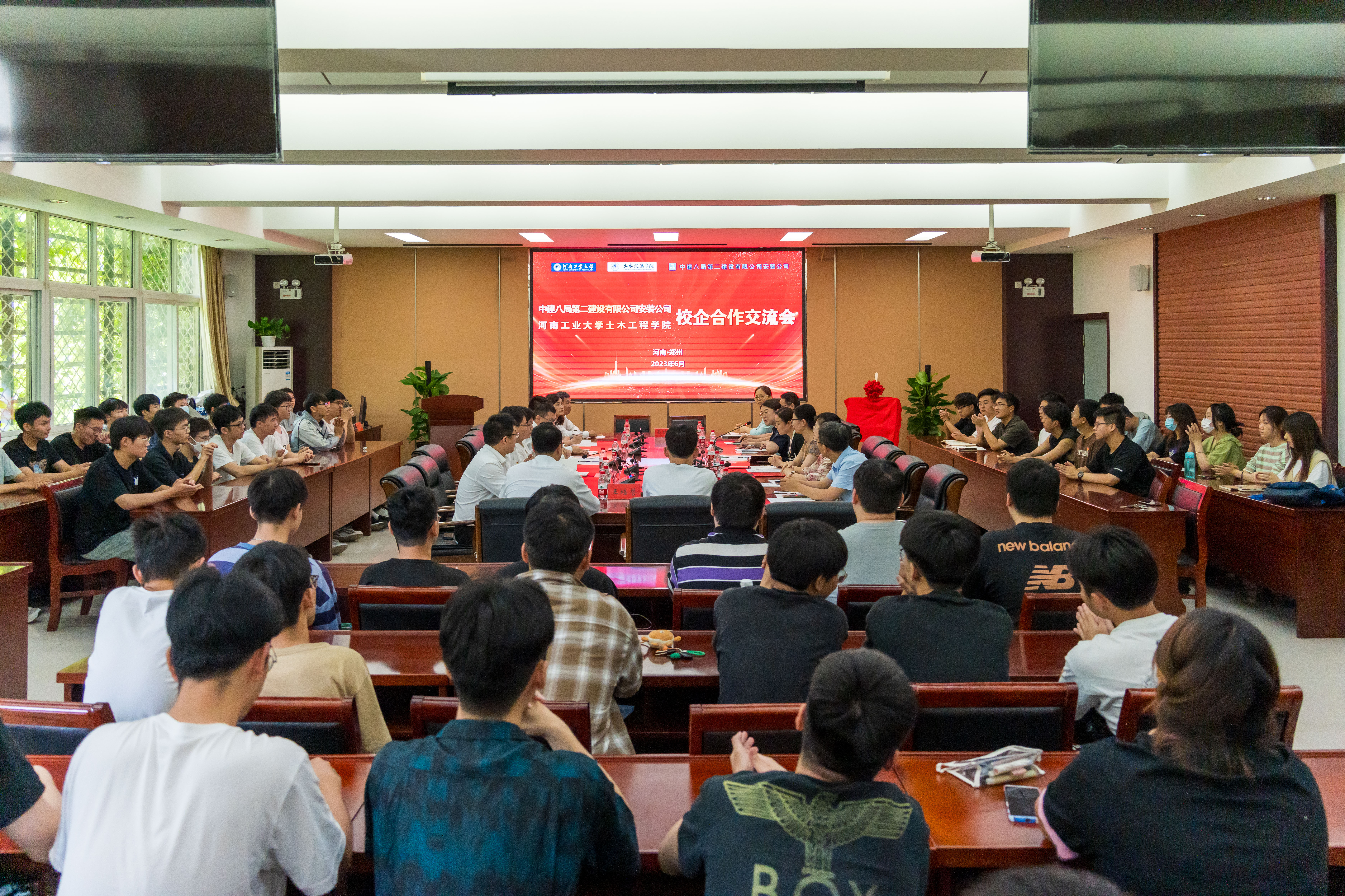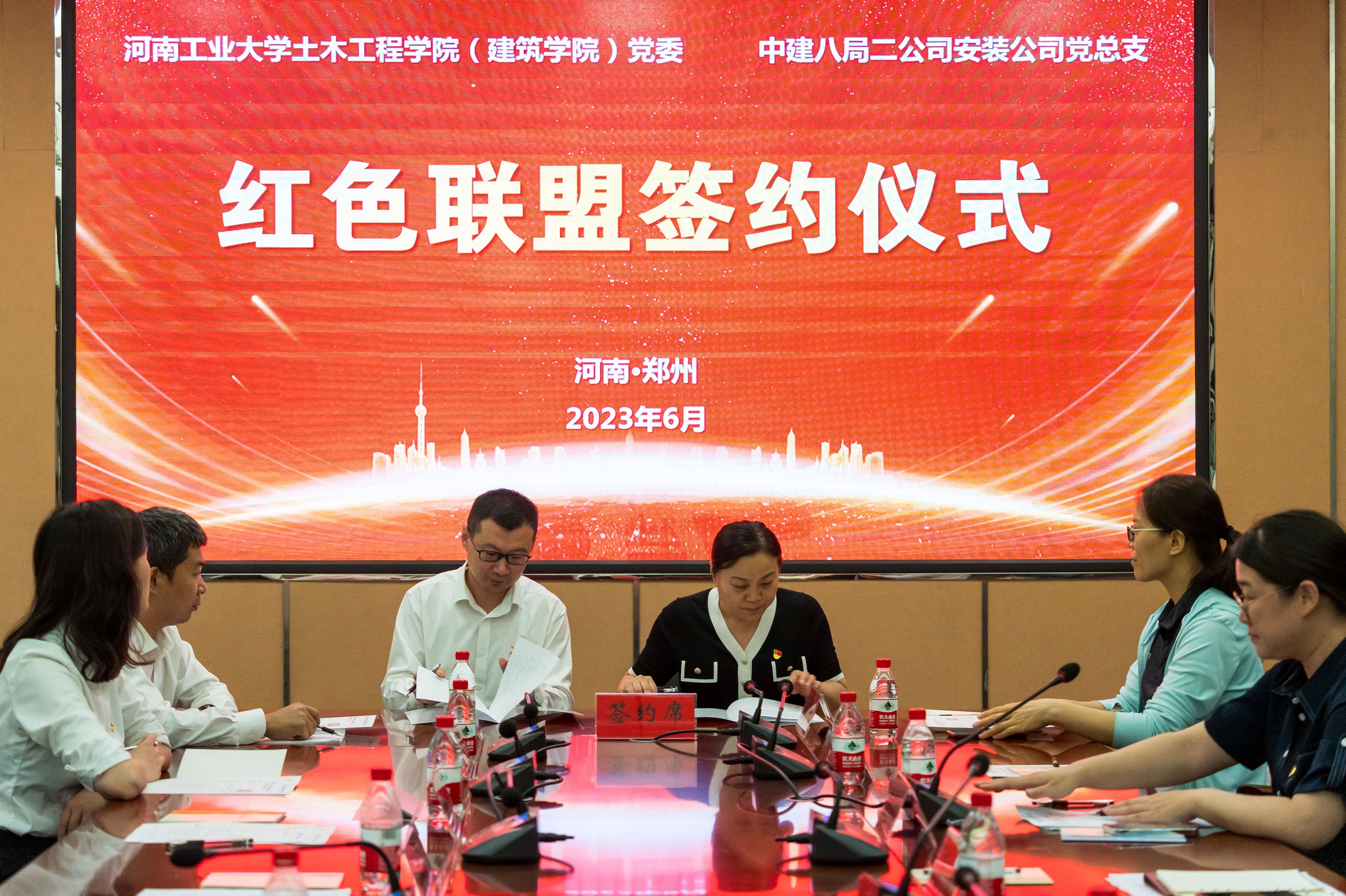 6月19日下午,足球比分app 与中建八局二公司安装公司在32208会议室举行校企党建联建活动暨“红色联盟”签约仪式。中建八局二公司安装公司工会主席、总会计师王东伟,公司中原区域负责人、党支部书记胡小波,中原片区党支部组织委员、校友代表王禹东等一行9人,来到河南工业大学足球比分app 走访交流。学院党委书记王影、党委副书记杨阳,建筑环境与能源应用工程系系主任、党支部书记陈曦、教师代表和学生代表参加了会议,会议由学院团委书记闫静茹主持。