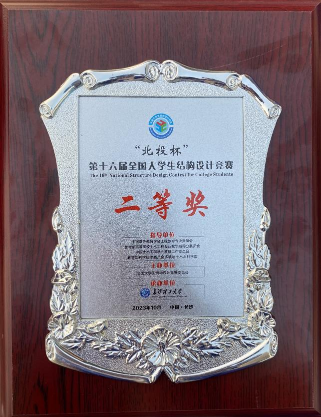 10月30日,中国高等教育学会工程教育专业委员会、教育部科学技术委员会等主办,长沙理工大学承办的第十六届全国大学生结构设计竞赛在长沙理工大学云塘校区体育馆落下帷幕。由崔璟、咸庆军老师指导,土木工程专业李安楠、杜佳乐,建筑学专业张翼三名同学自主完成作品的“奇异桥”斩获全国二等奖。至此,我校学子已连续两届荣获二等奖。