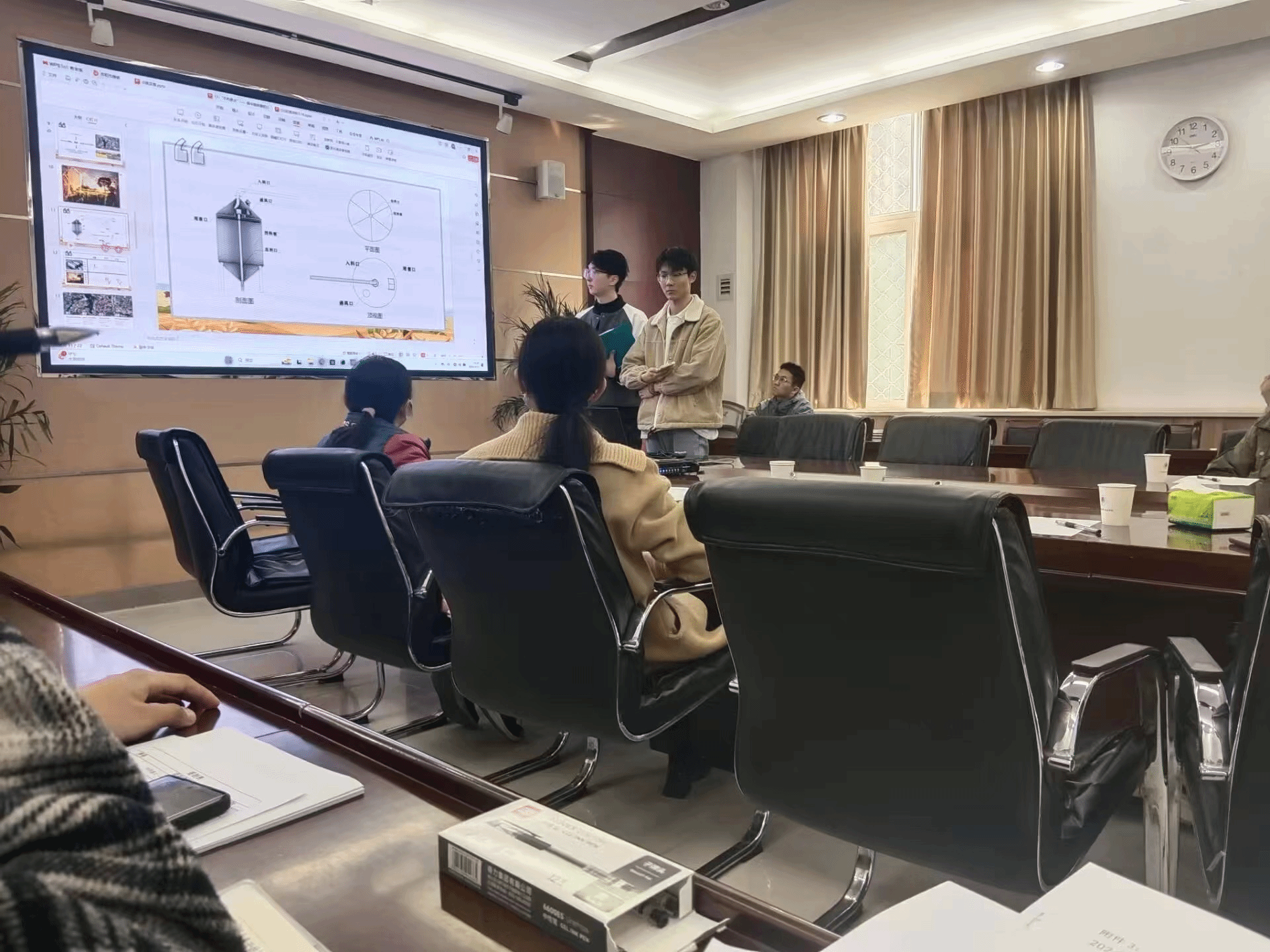 各汇报团队以PPT的形式分别从项目的研究背景、实践过程、市场前景及应用价值等方面进行了阐述,言简意赅。之后团队成员与教师答辩,指导老师就技术指标、应用效果等方面提出了改进意见,同学们受益匪浅,在上一次指导的基础上有了更深的理解。