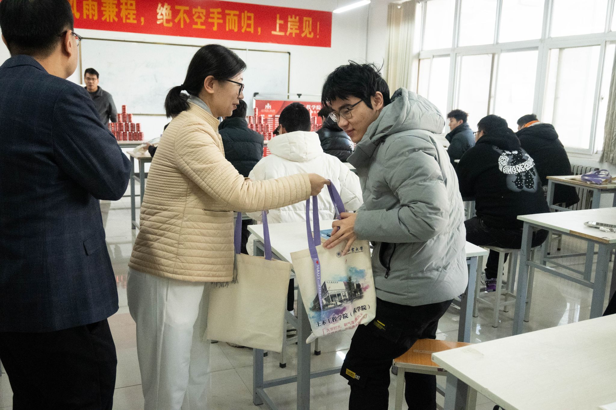 领导老师们走到考研学生座位边,将写满祝愿的纪念品送到同学们手中,并与学生们进行了亲切的交流,详细询问了他们的备考进度与心理状态,叮嘱同学们要保持良好的身心状态,合理规划时间,积极从容地迎接考试。学院也将继续提供多形式的支持和服务,为同学们营造良好的学习和生活环境。