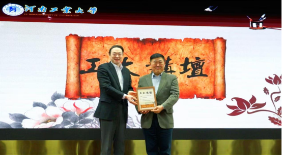 河南工业大学校长吴智深代表学校向周绪红院士赠送工大讲坛纪念海报,并与师生代表合影留念。