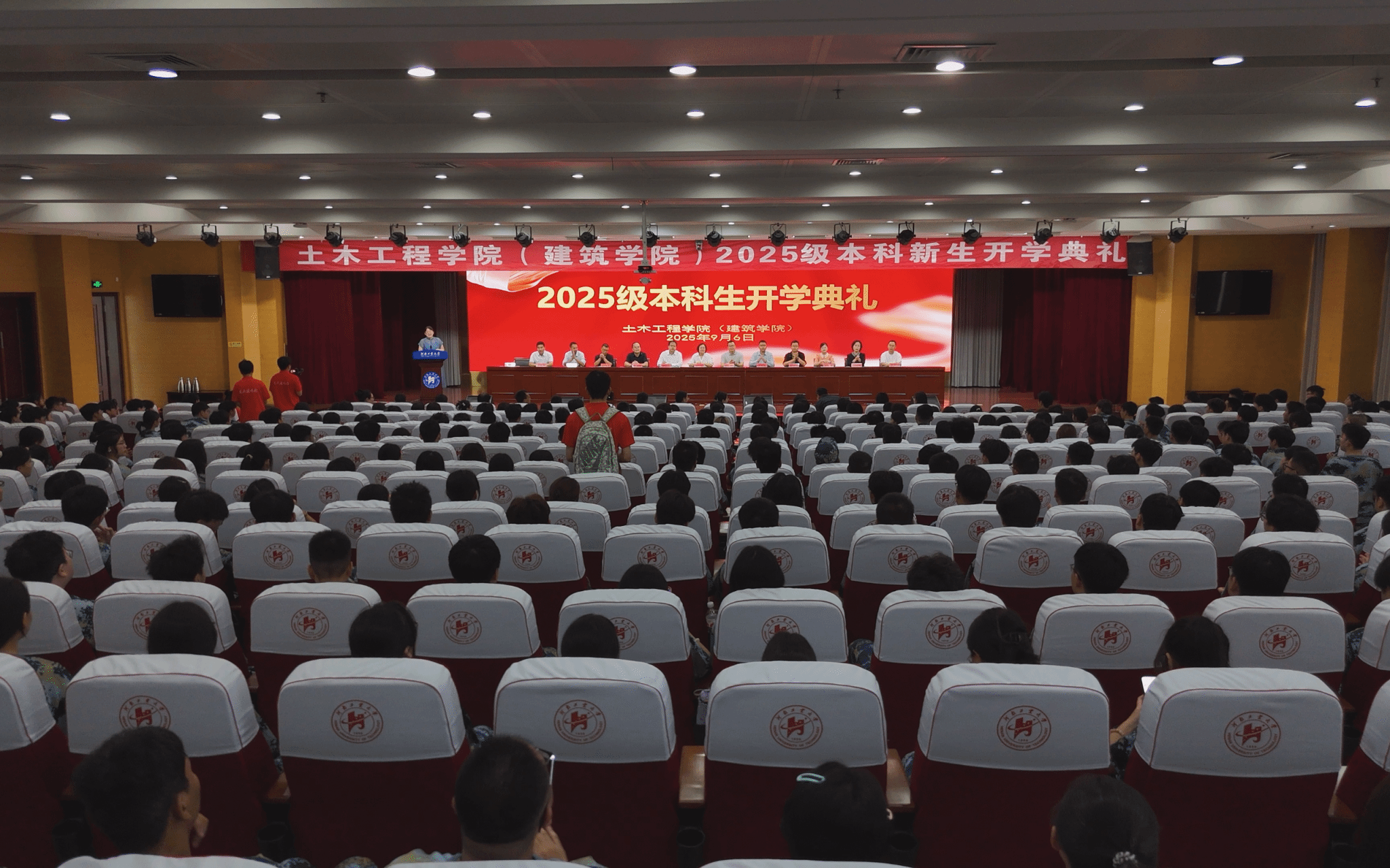 自信向前,奏响青春激昂乐章;心怀憧憬,未来必成璀璨星光。9月6日上午,土木工程学院(建筑学院)2025级本科生开学典礼在学术报告中心D303报告厅举行。学院领导、各系中心主任、全体辅导员和新生班主任参加典礼。典礼由学院团委书记闫静茹主持。