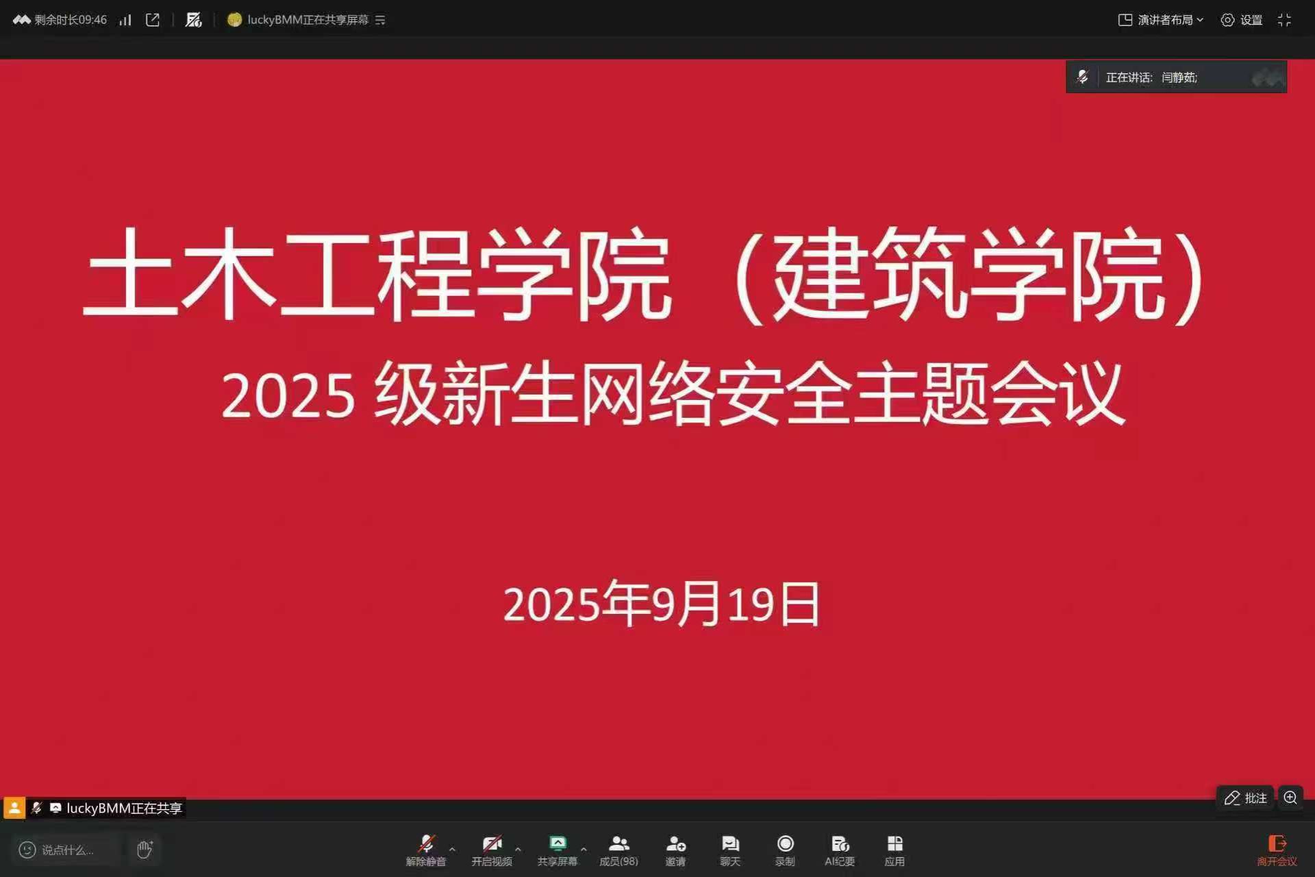 会议伊始,闫静茹老师围绕“大学生网络安全”核心主题,结合校园常见网络诈骗案例、个人信息保护要点及健康上网准则,向新生系统讲解网络安全知识,引导新生提高风险防范意识,树立 “安全用网、理性上网” 的观念,为接下来的大学生活筑牢安全防线。