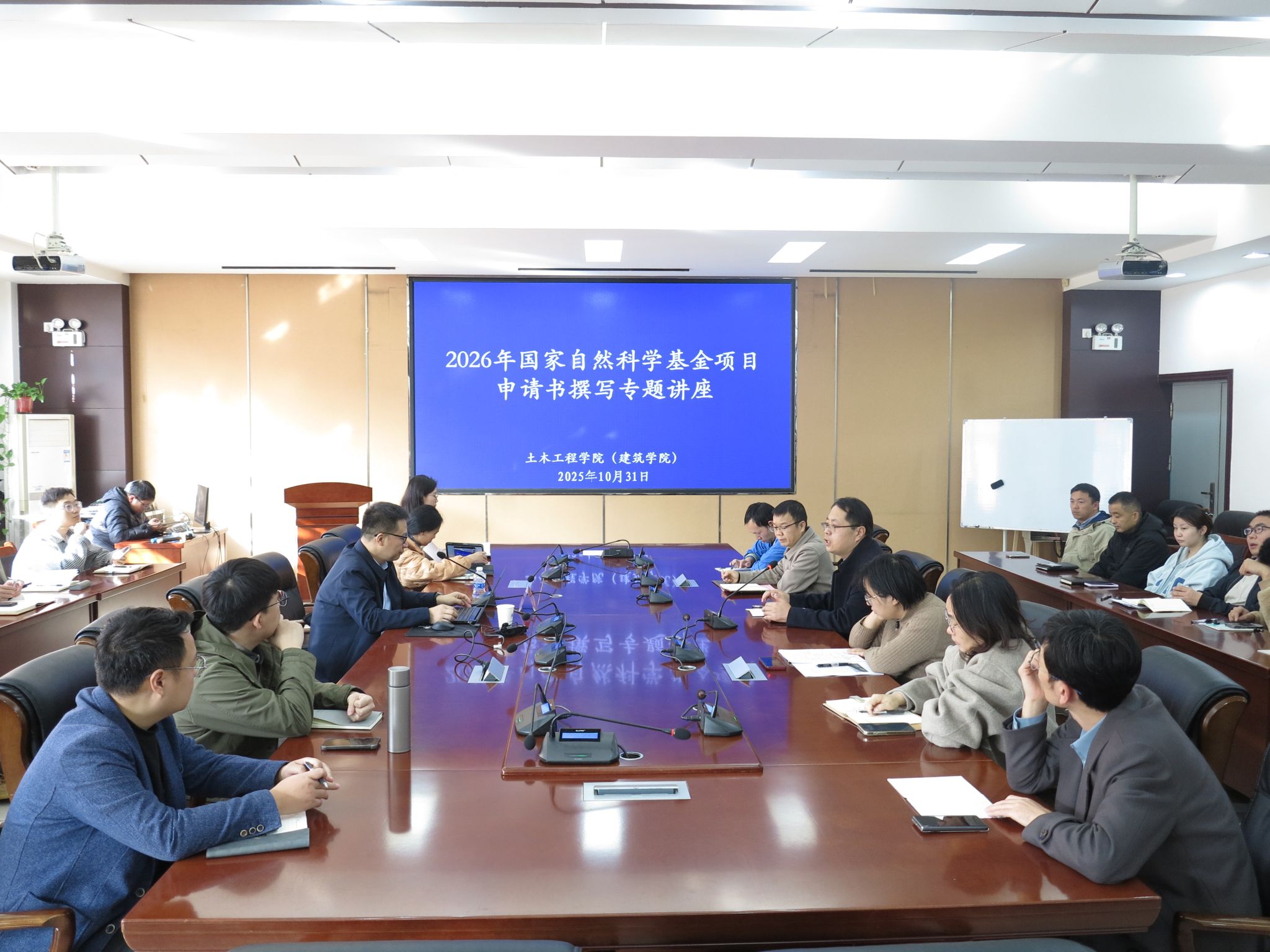 为切实做好2026年度国家自然科学基金项目申报工作,有效提升项目申请书质量与立项率,学院于2025年10月31日下午在32208会议室,举办了国家自然科学基金项目申请书撰写专题讲座。本次讲座邀请武汉大学郑俊杰教授担任主讲,讲座题为“国家自然科学基金项目申请书撰写的一点体会”。院长丁永刚、学术副院长徐志军和2026年国基金全体申报教师参加了会议,会议由丁永刚主持